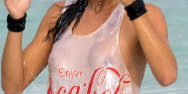 La supermodelo brasileña Adriana Lima estaba de vacaciones en Cancún cuando se metió en el agua llevando una camiseta blanca de la marca Coca-Cola.